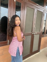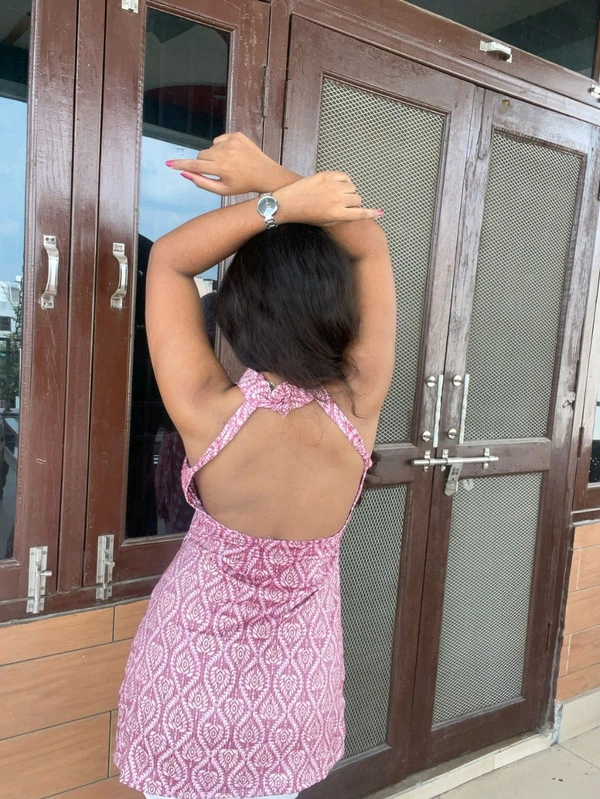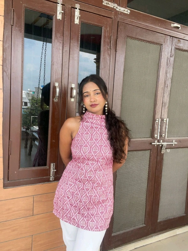 Elevate your ethnic fusion look with this trendy halter neck short kurti featuring a stunning open-back tie-up design. Crafted in a breathable cotton blend with a beautiful pink and white ethnic print, this kurti brings together tradition and modern flair. Perfect for styling with denim, skirts, or palazzos for a bold and stylish look.