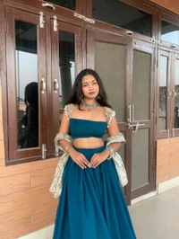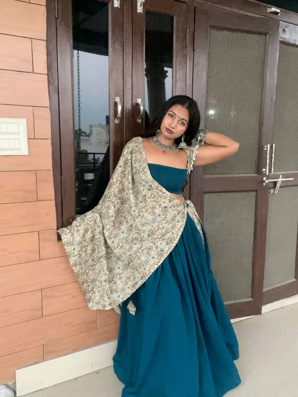 This teal blue lehenga set strikes the perfect balance between elegance and modern design. The flared skirt flows beautifully, while the stylish tie-up blouse adds a chic twist to traditional wear. Paired with a printed dupatta in earthy tones, this ensemble is ideal for festive celebrations, weddings, and cultural occasions.