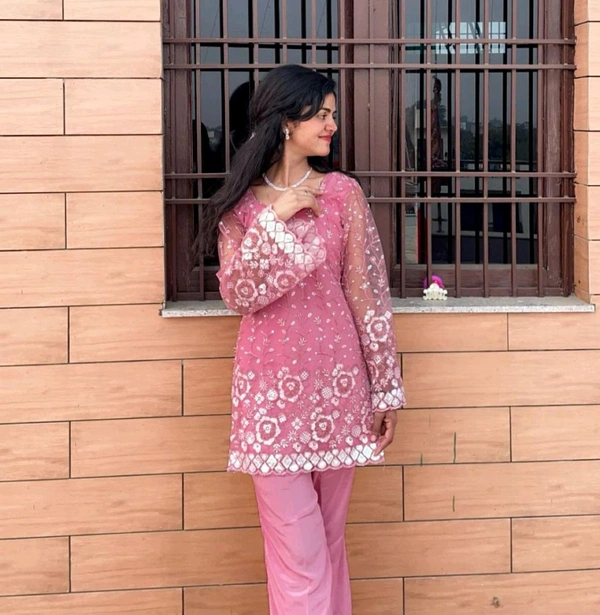 Step into elegance with our baby pink embroidered net kurti set! Featuring dreamy bell sleeves and matching bell-bottom pants, this look blends tradition with a modern twist—perfect for those who love soft glamour and ethnic grace.