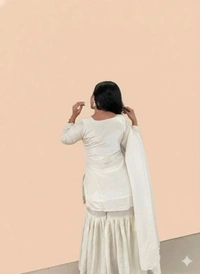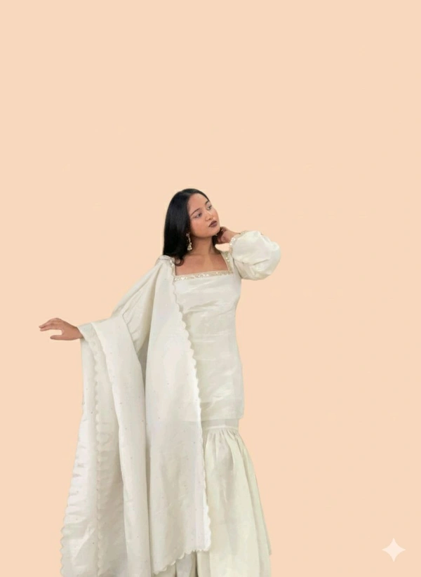 Step into timeless elegance with our Ivory Elegance Sharara Suit Set, a perfect blend of sophistication and simplicity. Crafted from premium fabric, this three-piece ensemble includes a straight-fit kurta, flared sharara pants, and a delicately scalloped dupatta. The serene ivory tone radiates understated charm, making it ideal for festive gatherings, pujas, or family celebrations.