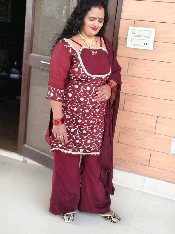 This three-piece set features a maroon muslin kurta intricately embroidered with golden floral threadwork, highlighted with delicate lace edging on the neckline and hem. The flared palazzo adds a graceful fall, while the matching chiffon dupatta completes the look with effortless sophistication.