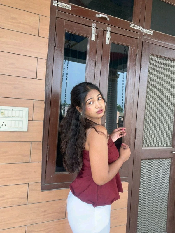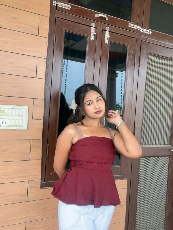 Elevate your everyday style with this elegant Maroon Pleated Peplum Top, perfect for casual outings, brunch dates, or semi-formal events. Designed with a structured pleated bodice and a flared hem, this top beautifully enhances your silhouette. The soft, breathable fabric ensures comfort while the adjustable transparent straps add a modern twist. Pair it with high-waisted jeans, trousers, or skirts for a chic and confident look.