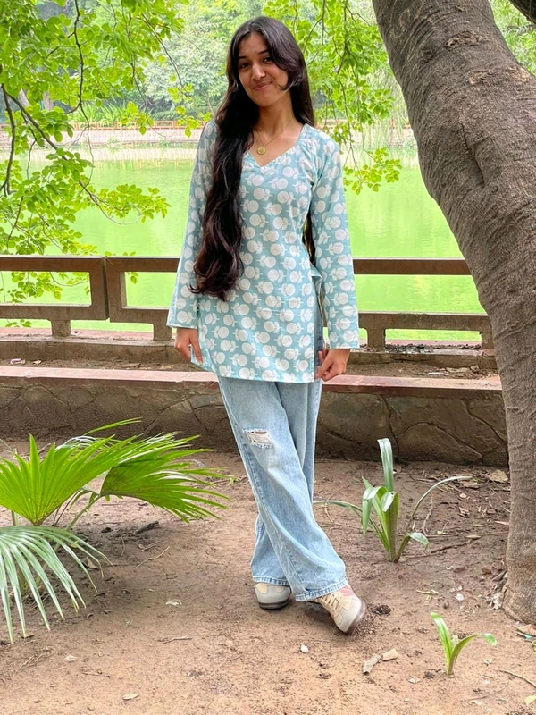 Step into effortless style with our Pastel Blue Printed Cotton Kurti, perfect for casual outings, college, or a relaxed day at the park. Made with soft, breathable cotton, this kurti features a delicate floral polka-style print in white, paired with a subtle pastel blue base. The straight cut and V-neckline offer a flattering silhouette, while the full sleeves add a touch of grace and comfort.
