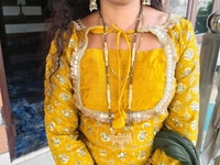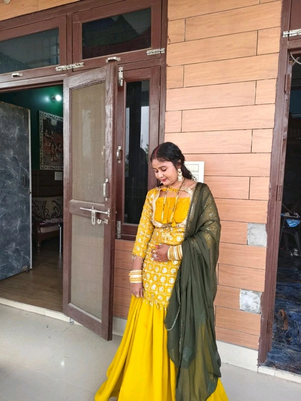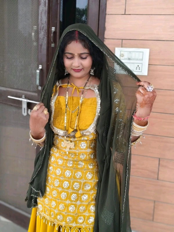 Turn heads in this vibrant, traditional Mustard Yellow skirt suit. The short, full-sleeve kurta is intricately decorated with sparkling Gotapatti (or mirror work), giving it an authentic, festive glow. It's perfectly paired with a floor-length, full-flared Ghagra (skirt) for a graceful silhouette. Finished with a contrasting Dark Olive Green dupatta, this ensemble is your perfect choice for Haldi, Mehendi, and all your special occasions.