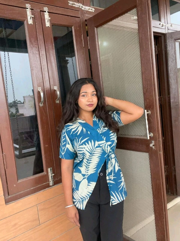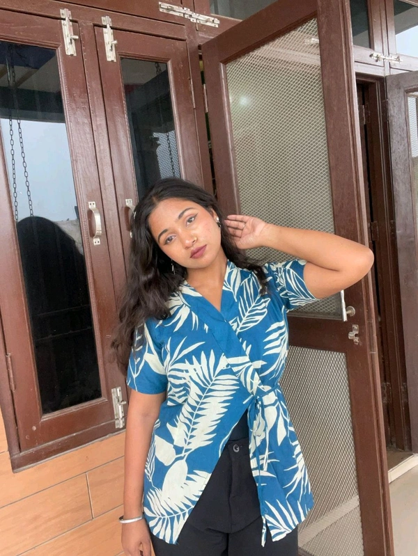 Step into effortless style with our Tropical Leaf Print Wrap Tie-Up Top, perfect for casual outings, vacations, or relaxed weekends. Featuring a refreshing blue base with bold white tropical leaf patterns, this top exudes a breezy, laid-back vibe. The wrap tie-up design at the front not only adds a flattering fit but also gives it a trendy, modern touch. Short sleeves and a lightweight fabric make it ideal for warm weather while keeping you comfortable and stylish all day long.