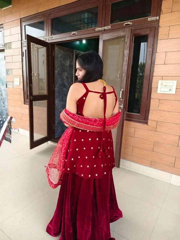 This deep maroon velvet set features a sleeveless tie-back blouse adorned with delicate golden polka embroidery, paired with a flowy velvet skirt that moves beautifully with every step. The look is completed with a maroon net dupatta detailed with intricate geometric zari work — adding a royal touch to your festive wardrobe.